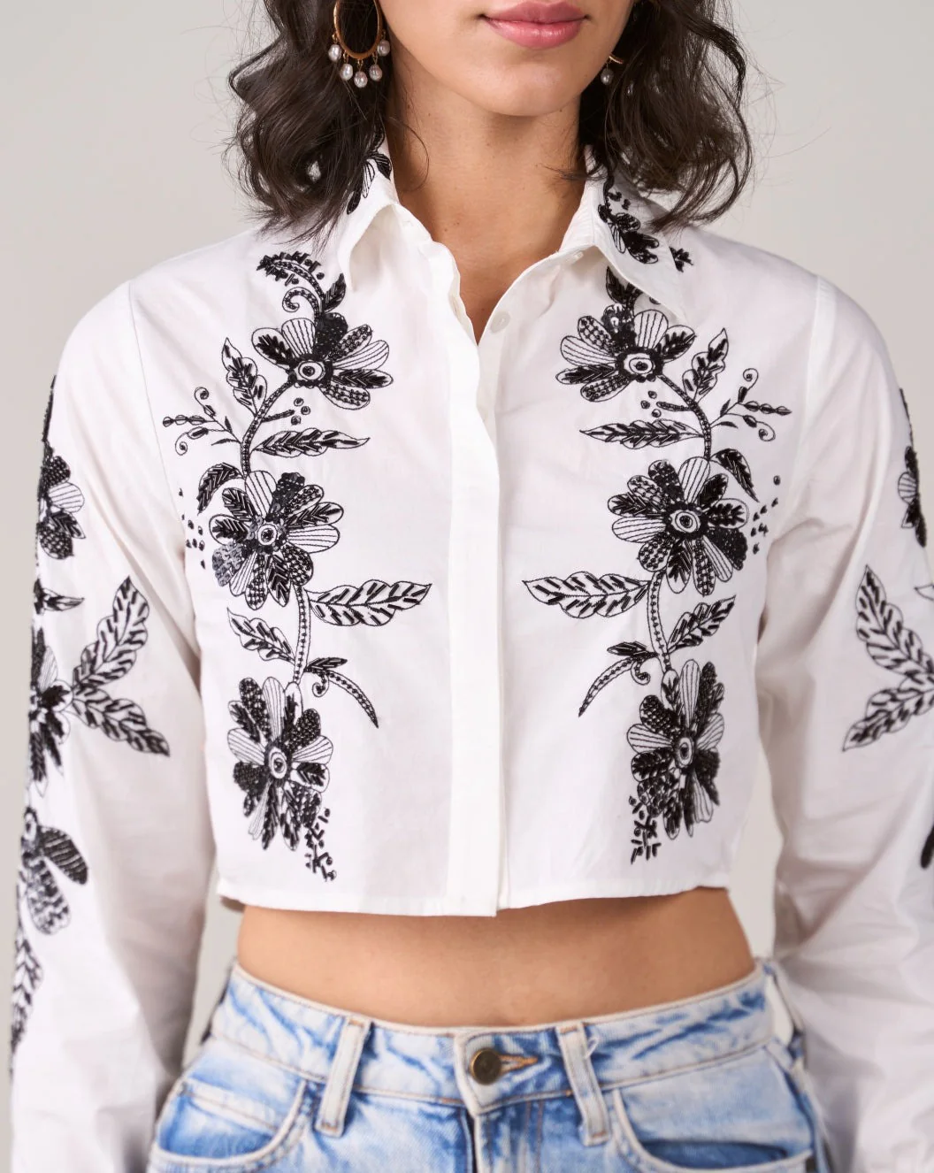 Introducing the Lauren Embellished Shirt – a chic and versatile addition to your wardrobe. This white shirt boasts a cropped length with hand-beaded, black sequin embroidery that adds a touch of elegance. The cool button-down style makes it the perfect piece to embrace understated sophistication.