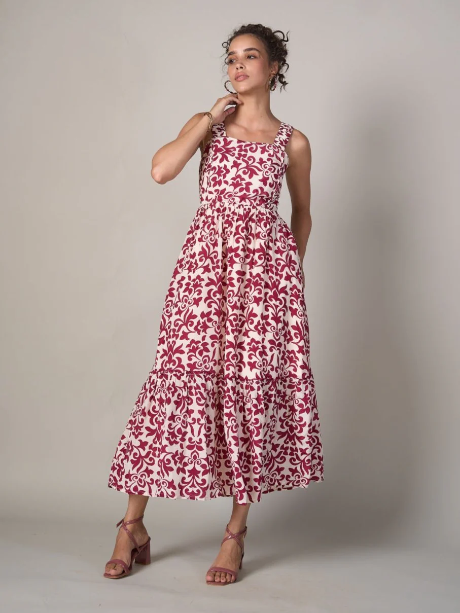 Unleash your inner enchantress with the "Mystic Motif Dress". This captivating dress features an intricate white and maroon print inspired by mesmerizing motifs, adding a touch of mystique to your look. The sleeveless design and smocking detail at the back provide a comfortable and flattering fit, while the luxurious moss crepe fabric drapes beautifully.